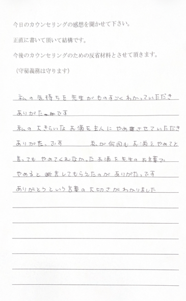 私が何回もお酒をやめてと言ってもやめてくれなかった。お酒を先生のお言葉で辞めると断言してもらったのがありがたかったです。