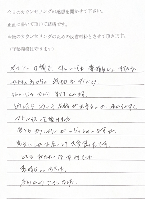 いろいろなカウンセラーがいらっしゃいますが、先生にお会して大変よかったです。